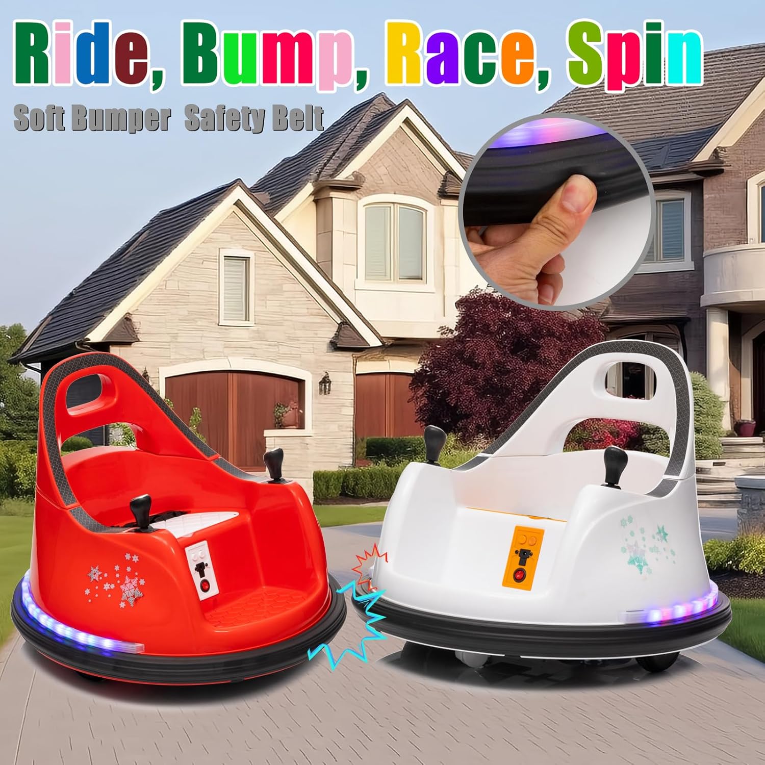 [360 Degree Spin] Kids can use the electric bumper car to ride, race, spin and bump all around the indoor and outdoor. Electric toy bumper car with 360 degree spin for more riding fun. The maximum weight capacity is 66 lbs